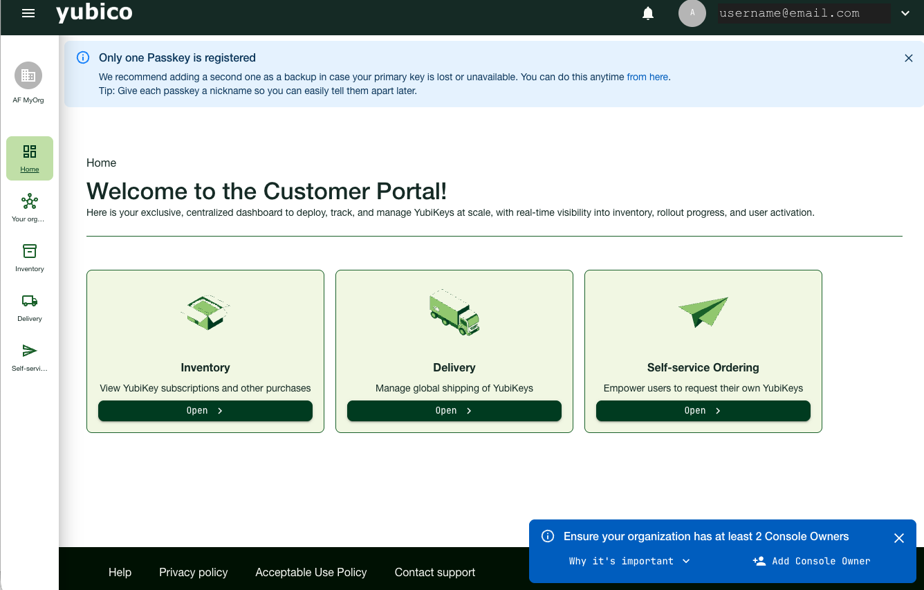 - Add an additional Console Owner for your organization, if not already done (you must first have registered a YubiKey to be able to do this). It is recommended to have at least two users with the Console Owner role. Click Add Console Owner in the notification message at the bottom right of the page.