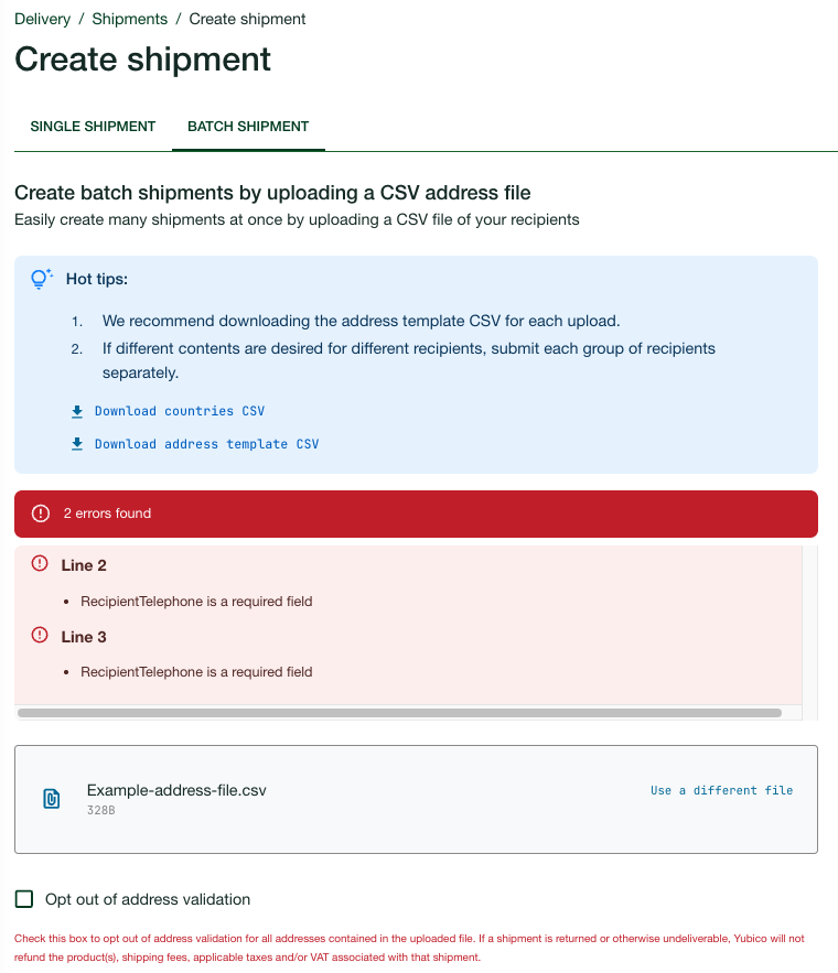You then upload the file, select the products that all recipients will get, and submit the batch shipment request for the products to be shipped to multiple addresses. If different recipients require different product sets, create a separate CSV file for each product set.
