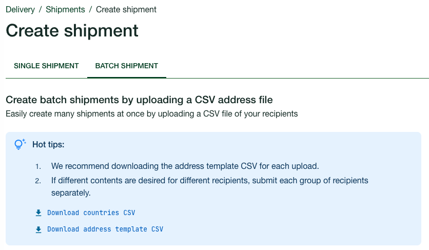 In the Customer Portal, click Delivery > Shipments in the left menu. Then click Create shipment in the top menu and select Batch shipment.