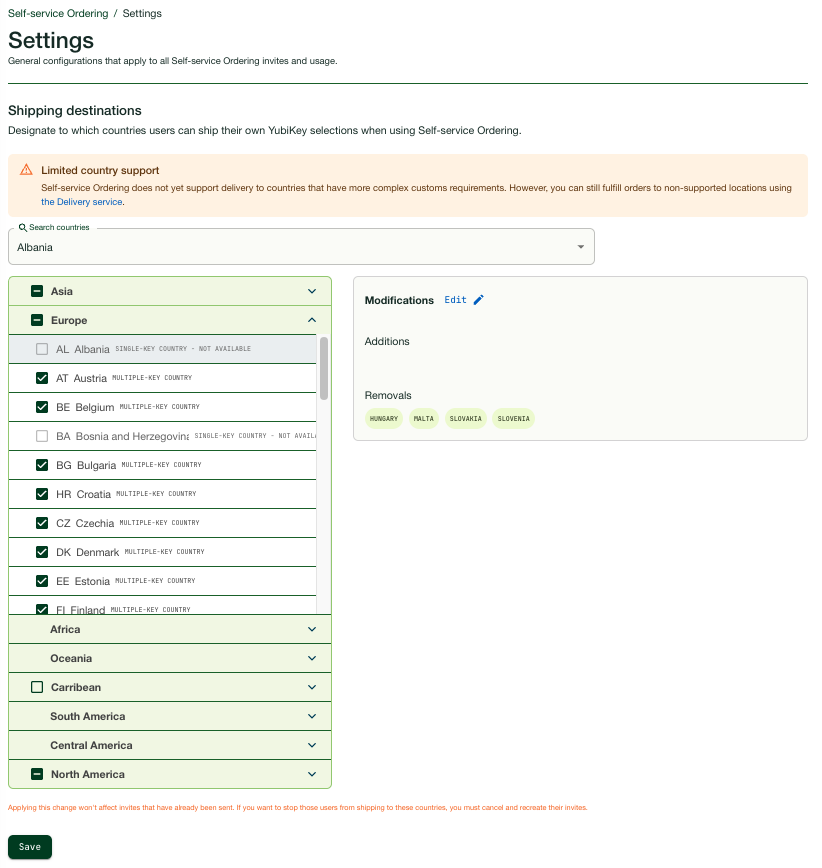 To enable or disable a country, click a region (for example Europe) to expand it, and select or deselect desired countries in the list. The changes to the current country selection are displayed in the Modifications section. If you regret a change you made, click the Edit icon to update the modifications. When done updating, click Save.