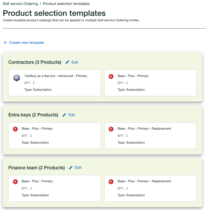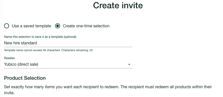 Using product selection templates you can create invites reusing information about product selections and quantities, for example to send the same set of YubiKeys to new employees joining your organization.