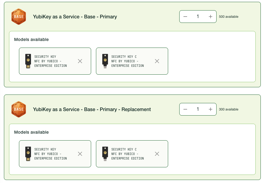 Example: If you have a “Base - Primary” and a “Base - Primary - Replacement” inventory, and allow recipients to choose one key from each, this means that each recipient can choose in total two YubiKeys from the models available. If you send the invite to 25 recipients, this will consume 25 “Base - Primary” licenses and 25 “Base - Primary - Replacement” licenses, in total 50 licenses.