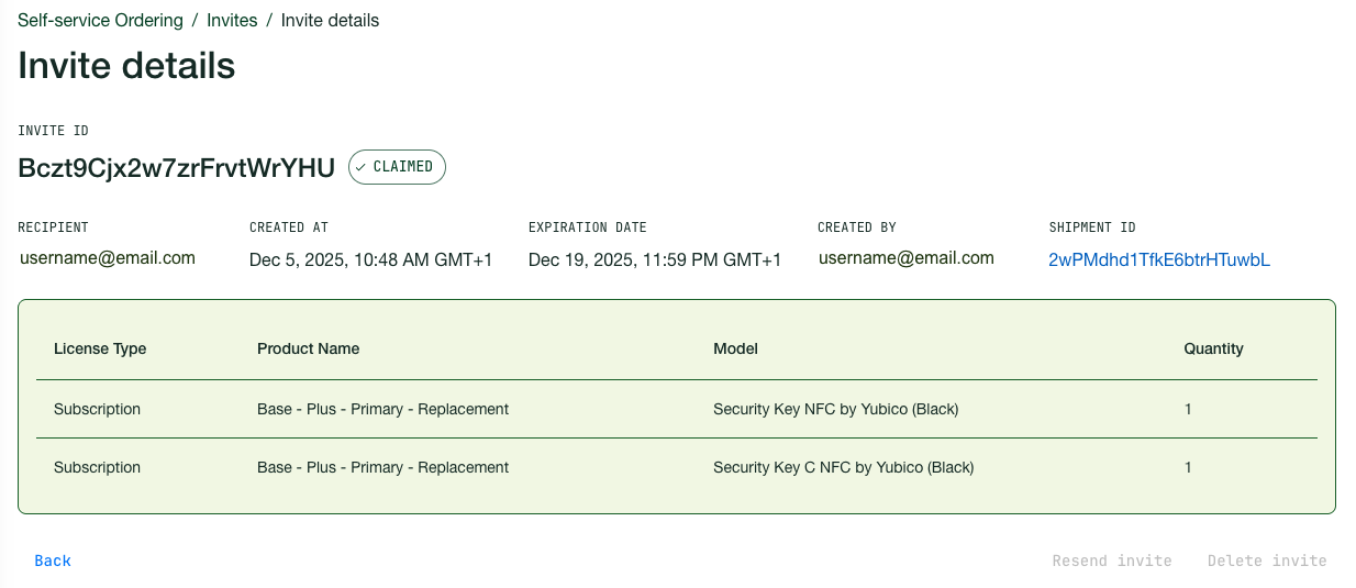 Invites are reservations of inventory from which an organizations’ end users can select from a designated number of YubiKeys or accessories and have them shipped to their personal address.