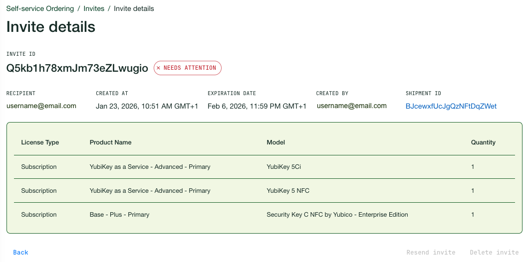 In the following example, a sent invite that has been claimed by the recipient, triggered the creation of a shipment request. However, when processing the shipment request, an error occurred, and the invite therefore has the status “Needs Attention”.