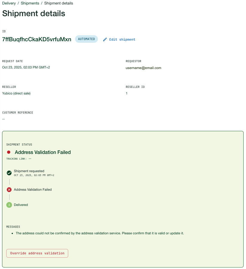 The recipient selects their desired YubiKey model and enters their delivery address, which is validated in real-time for deliverability. The recipient providing their delivery address themselves greatly reduces the risk of incorrect delivery addresses causing delivery failures. When the invite claim is submitted, a shipment request is created under your account in the Delivery service. The recipient can track the delivery of their shipment in their Self-service Ordering web page.