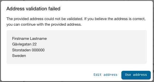 The system validates the address provided. If the validation fails, the recipient is presented with the option to either edit the address, or use the provided address. If using an address for which the validation failed, the created shipment will get the status “Address Validation Failed”. In this case the administrator can choose to override the validation to send the shipment through for fulfillment, or delete the shipment. See Overriding Address Validation.