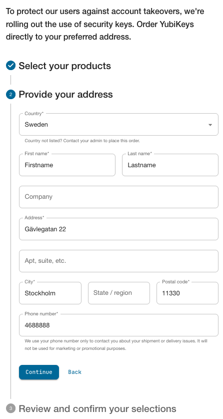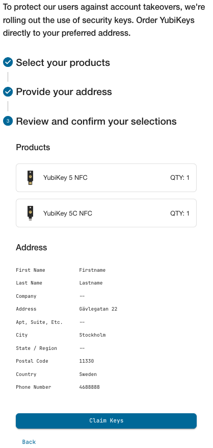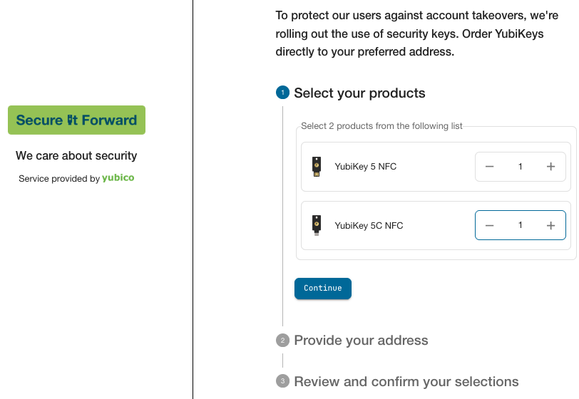 Using Self-service Ordering you can create a branded user experience where recipients can claim YubiKeys assigned to them by your organization. Recipients can be for example employees, contractors, or your customers. The recipient selects their products and provides the preferred address to which the YubiKeys will be shipped using the Delivery service.